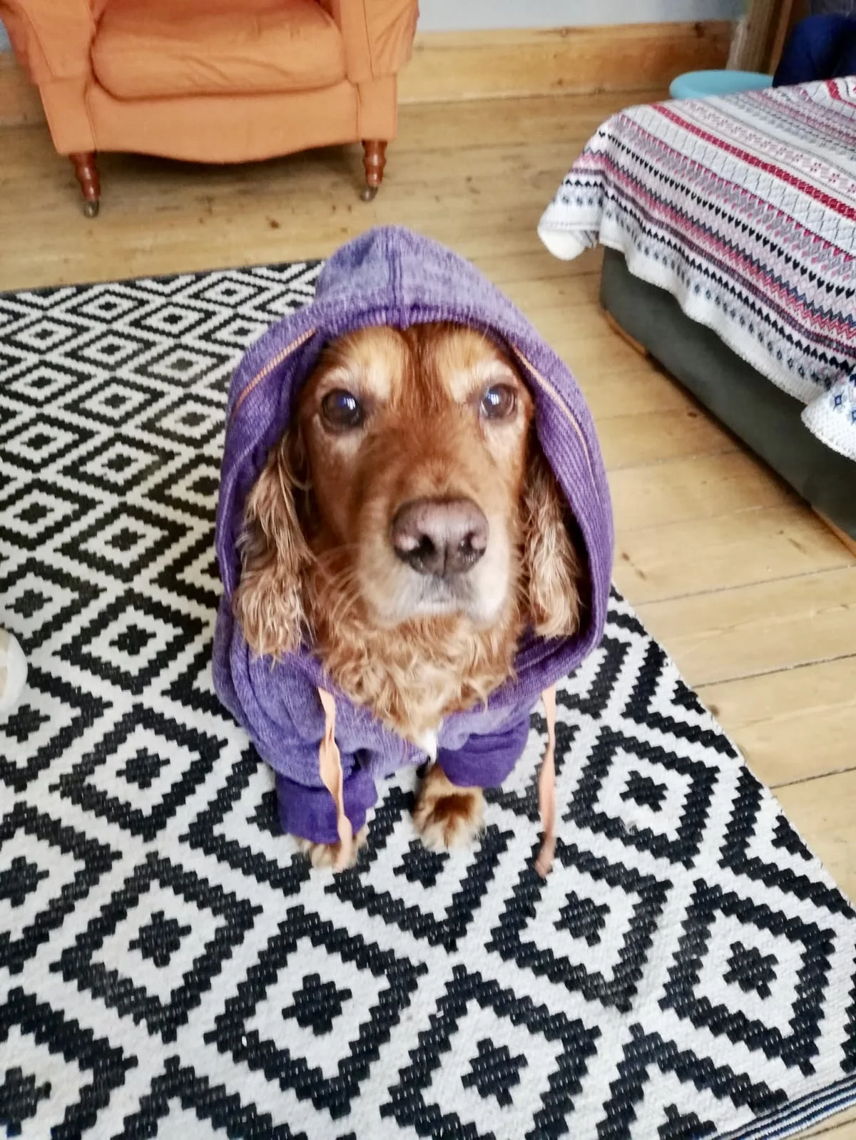 the endearingly anthropomorphised spaniel just chillin’ in his new-to-him onesie after playing in the sea